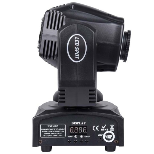 sound, w którym głowa ruchoma LED synchronizuje swoje działanie z rytmem i dźwiękami muzyki pochodzącymi z otoczenia, za pomocą czułego mikrofonu zainstalowanego w korpusie obudowy;