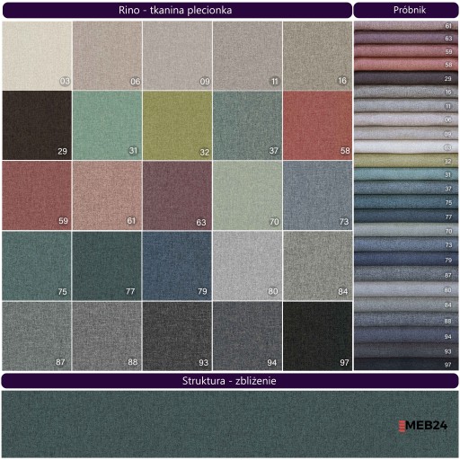 ➡️ Rino ➥ Drobna tkanina typu plecionka o melanżowej strukturze w szerokiej palecie kolorów. Delikatne, przeplatane nitki są wytrzymałe i dają tkaninie efekt delikatnego połysku. Tkanina jest odporna na ścieranie i wyprodukowana w technologii Easy Clean przez co meble w nią ubrane są łatwiejsze do czyszczenia i wolniej wchłaniają wodę. Tkanina posiada unijny certyfikat REACH oraz OLEO-TEX 100.
