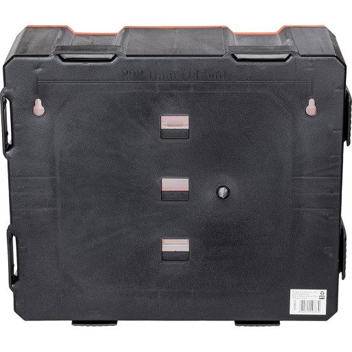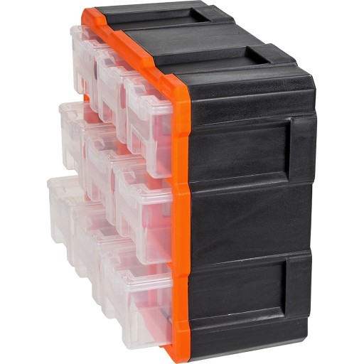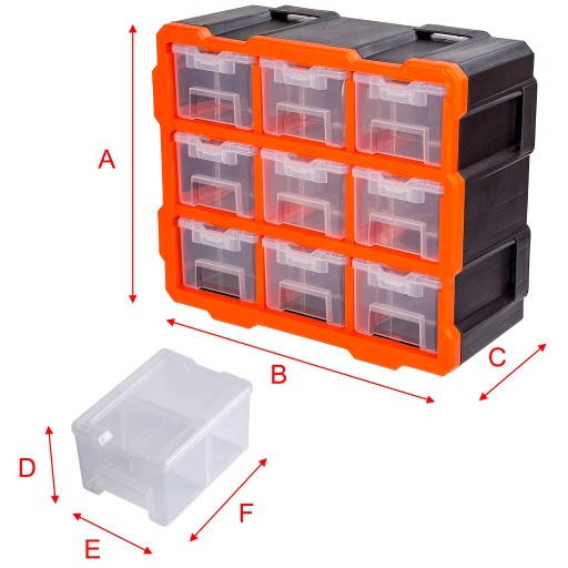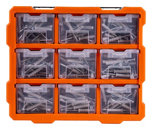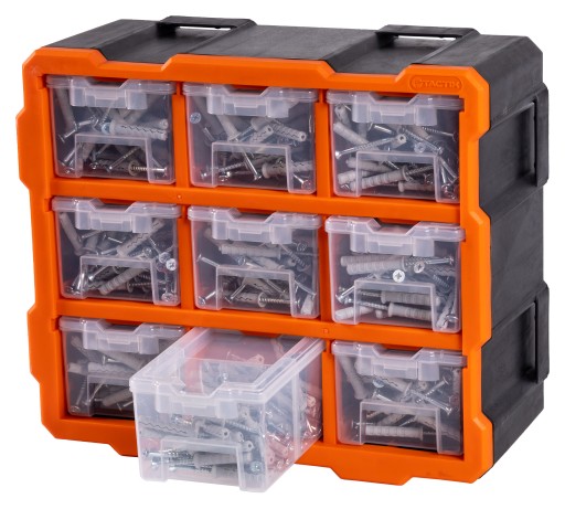 Organizer umożliwia wygodne przechowywanie i przenoszenie drobnych akcesoriów. Może być zawieszany na ścianie lub stawiany na blacie. Skrzynka zawiera 9 transparentnych pojemników do przechowywania wkrętów, śrub, podkładek, końcówek kablowych i innych drobnych elementów. Każdy pojemnik posiada wyjmowaną przegrodę zwiększającą funkcjonalność, uchwyt na palce ułatwiający wysuwanie a korpus konstrukcji blokadę zabezpieczającą przed przypadkowym wypadnięciem szufladki. Nadaje się do zastosowań profesjonalnych w warsztatach, garażach jak i domowych, hobbystycznych.