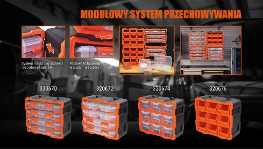 Wykonany z czystego tworzywa PP (nie przemiału) co zwiększa trwałość konstrukcji korpusu oraz pojemników, odporność na uszkodzenia, transparentność szufladek a wysoka jakość i estetyka wykonania sprawia, że moduł z powodzeniem może być wykorzystywany nie tylko w warsztatach czy garażach ale również w pomieszczeniach domowych.