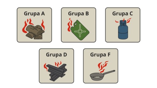F Pożary tłuszczów: Pożary tłuszczów i olejów w urządzeniach kulinarnych.