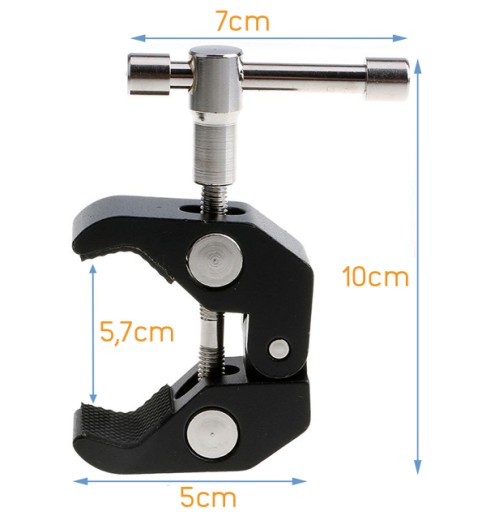 Niezbędny w każdym studiu fotograficznym i nie tylko. Posiada dwa rodzaje otworów gwintowanych 1/4'' i 3/8'' wykorzystywany w fotografii , dzięki czemu możemy zamocować belkę poprzeczną służącą do montażu lamp, blend oraz parasoli. Uchwyt posiada regulację, więc możemy dopasować go do belek o różnej grubości.