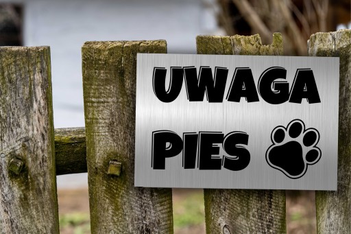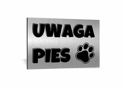 TABLICZKA "UWAGA PIES" 21 x 14,5 cm. WYKONANA Z DIBONDU SZCZOTKOWANEGO, ZADRUKOWANA METODĄ UV. BARDZO TRWAŁA I ELEGANCKA.