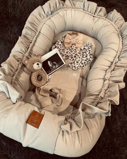 KOKON NIEMOWLĘCY "VELVET" wykonany został wysokiej jakości miękkiego, ciepłego VELVETU oraz obszyty dekoracyjną falbanką w kolorze kokonu.