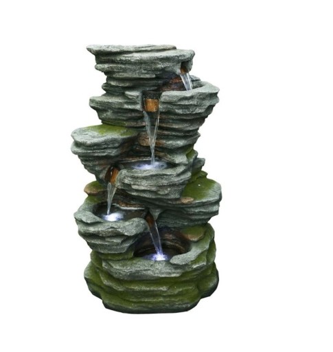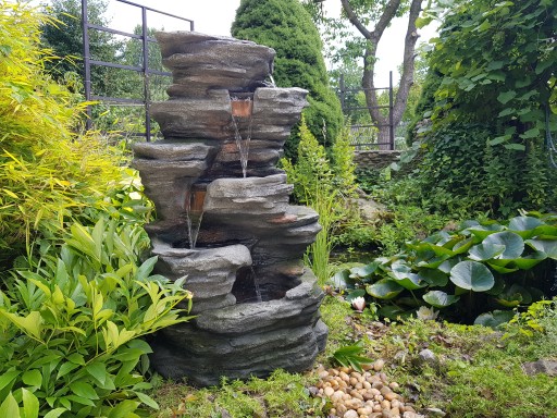 Bez wątpienia ta fontanna będzie ciekawym elementem dekoracyjnym w naszym ogrodzie i tarasie jej ciekawy wygląd przypominający kamień typu łupek będzie się wyróżniać w każdym otoczeniu .Woda spływa kaskadą spadając kolejno do niecek. Model wyprofilowany tak aby można było ustawić ją w narożniku ściany lub muru. Można wpasować w nowoczesną stylistykę ogrodu lub tarasu a także ogrodzie pośród roślin i zieleni. W tym modelu fontanny każda niecka wyposażona jest w światła led o barwie zimnej które po zmroku nadają jej dodatkowego uroku . Ciekawy szum wody daje jej charakteru a nam strefę relaksu.