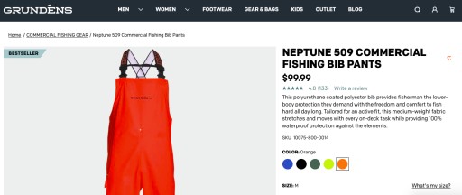 - Spodnie wędkarskie marki Grundéns pochodzące z kolekcji COMMERCIAL FISHING GEAR. Są to spodnie typu ogrodniczki wykonane w 100% z wodoodpornego materiału. Spodnie są na regulowanych szelkach. Po bokach posiadają elastyczną siateczkę, która pełni funkcję wywietrzników a ponadto sprawia, że ogrodniczki lepiej dopasowują się do sylwetki. Spodnie mają proste nogawki z regulacją u dołu za pomocą rzepu. Na wysokości uda znajduje się kieszonka zapinana na napy.