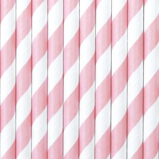 - Słomki papierowe w kolorze jasny róż z białymi ukośnymi paskami,