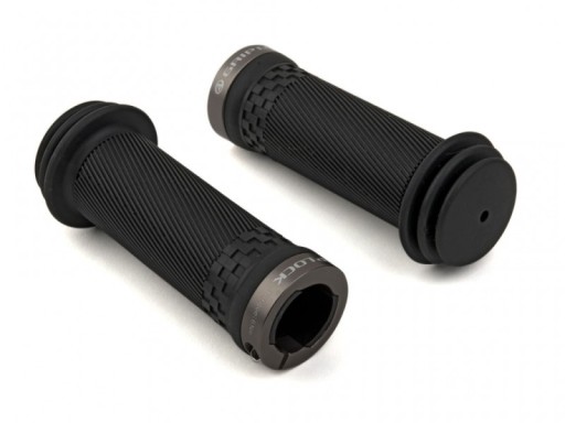 Dziecięce chwyty kierownicy wykonane z dwóch rodzajów gumy i osadzone na sztywnej tulejce z otworami. Skręcane na obydwu końcach przy pomocy aluminiowych pierścieni, co zapobiega obracaniu się chwytów na kierownicy. Bezpieczne wykończenie brzegów. Długość: 100 mm. Waga: 88 g (para). Kolor: czarne.