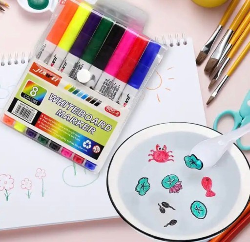 Zestaw zawiera 11 sztuk pisaków wodnych do rysowania plus plastikowa łyżka. Do zabawy potrzebna jeszcze będzie miseczka z wodą.