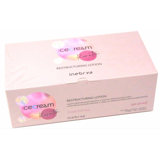 Inebrya Ice Cream Keratin rekonstruująca kuracja do włosów zniszczonych. To idealne rozwiązanie dla włosów suchych, puszących się i po zabiegach. Lotion zamknięty w ampułkach sprawia, że Twoje włosy będą odżywione, miękkie i znacznie łatwiejsze do rozczesania. Skoncentrowana formuła na bazie peptydów i keratyny sprawia, że włosy stają się gładkie i odżywione od wewnątrz. Produkt nie zawiera SLS/SLES, siarczanów. Kosmetyk o słodkim zapachu owoców granatu.