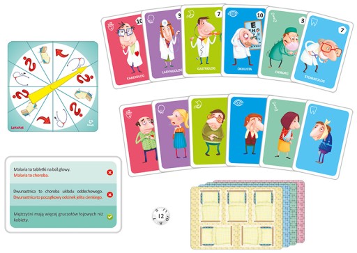 A gdyby zostać dyrektorem własnego szpitala?Lekarze to gra edukacyjna, która zapewni rozrywkę i pożyteczną wiedzę z zakresu biologii i ludzkiego ciała tym młodszym, jak i starszym graczom! Rozwiązuj zadania, wykaż się wiedzą i wylecz jak największą ilość pacjentów w swoim szpitalu. Dodatkowym plusem będzie umiejętność zarządzania i strategicznego myślenia godnego dyrektora szpitala. W pudełku znajdziesz karty z pytaniami o różnym poziomie trudności, karty lekarzy różnych specjalizacji oraz karty pacjentów. Chwytaj planszę, zakręć kołem i...na zdrowie!Zestaw zawiera:- 4 plansze graczy- 55 kart PRAWDA/ FAŁSZ- 24 kart lekarzy- 30 kart pacjentów- 12 ścienną kostkę- koło do losowaniaDzięki trzem poziomom trudności, w zabawę można zaangażować dzieci i dorosłych w każdym wieku!