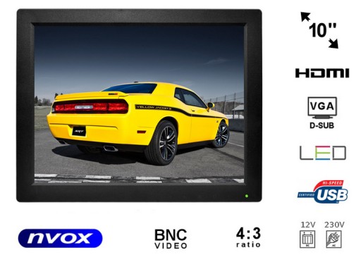 • wyświetlacz cyfrowy LED 10" • matryca TFT 4:3 (Active Matrix System) • rodzaj matrycy: błyszcząca • wbudowane głośniki • jasność 500:1, kontrast 1000:1 • rozdzielczość zalecana: 1024x768 px • obsługiwane rozdzielczości: 800x600 px, 1024x768 px, 1152x864 px, 1280x768 px, wyższe rozdzielczości są interpolowane do 1280x768 px • funkcja automatycznego wygaszania: off/10min/20min/30min/60min/90min/120min/180min/240min • funkcjonalne proste MENU • wejście VGA • wejście HDMI • wejście AV • wejście BNC • systemy: PAL/NTSC • pobór mocy 6W • temperatura pracy: -10°C - 60°C • temperatura przechowywania: -20°C - 80°C • zasilanie: DC 12V / AC 230V • kolor czarny • waga: ok. 1 kg • wymiary z obudową: szer. 240mm x wys. 190mm x gr. max 44mm • wymiary matrycy: szer. 198 mm x wys. 150mm