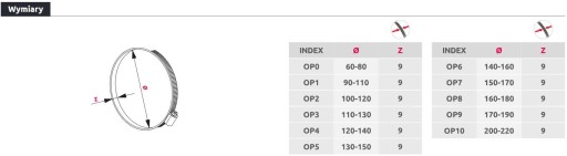Opaski zaciskowe OP wykonane są ze stali nierdzewnej. Znajdują szerokie zastosowanie przy połączeniach instalacji wentylacyjnych, spalinowych oraz wodnych. Ze względu na wysoki moment zaciskania mogą być stosowane w instalacjach wysokociśnieniowych. Dostępne są w rozmiarach od Ø60-80 do Ø200-220.