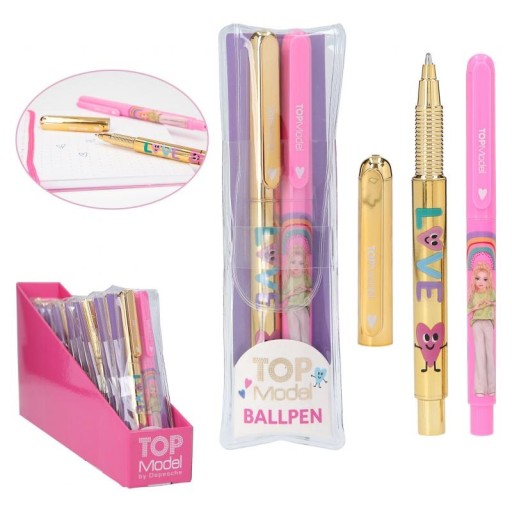 2 długopisy - błyszczący złoty długopis z napisem „Love” i uroczą ikoną serca oraz różowy długopis z fajnym nadrukiem TOPModel i tęczą