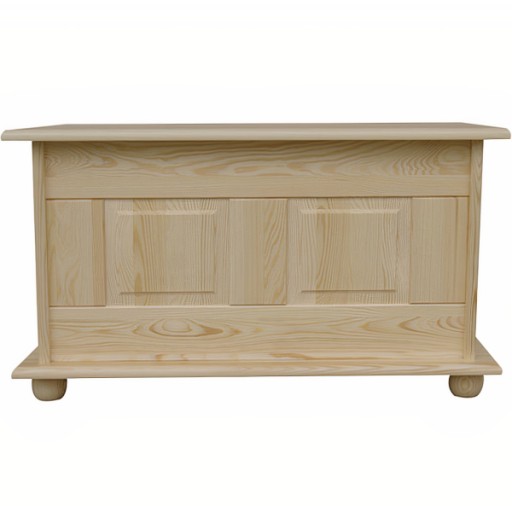 Drewniany kufer wykonany w całości z solidnego, litego drewna sosnowego, jedynie ścianka tylna wykonana jest z płyty pilśniowej. Zamontowane zostały solidne, płaskie oraz ozdobne zawiasy.