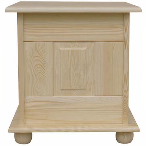 Drewniany kufer wykonany w całości z solidnego, litego drewna sosnowego, jedynie ścianka tylna wykonana jest z płyty pilśniowej. Zamontowane zostały solidne, płaskie oraz ozdobne zawiasy.