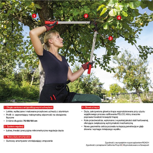 Seria FELCO 221 została zaprojektowana z myślą o potrzebach profesjonalistów. Jednak równie dobrze nadaje się dla hobbistycznych użytkowników, którzy chcą przycinać na wysokości w swoich ogrodach. Ostrza wykonane z hartowanej stali, kute przeciwostrze oraz uchwyty z tłoczonego aluminium gwarantują trwałość i niezawodność.