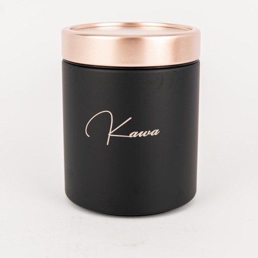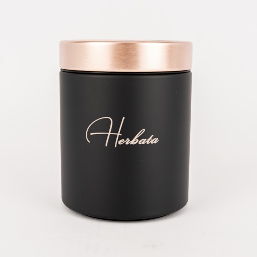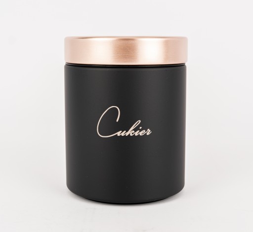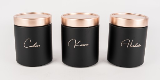 Komplet zdobiony jest polskimi napisami: Cukier, Kawa, Herbata co bardzo ułatwia użytkowanie. Zestaw zawiera 3 puszki wykonane z wysokiej jakości stali malowanej proszkowo na kolor czarny matowy. Pokrywki są w modnym kolorze Rose gold (złoty róż).