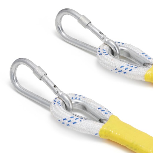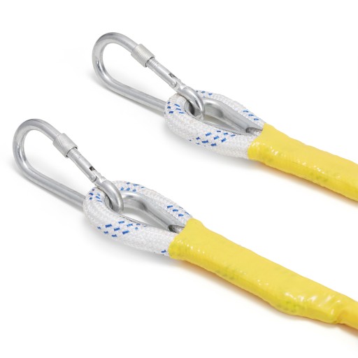 W razie konieczności zawieszenia na grubej okrągłej belce można bezpośrednio połączyć ze sobą dwie pętle stalowe i spiąć je karabińczykami. W razie konieczności (przy zawieszaniu na dużej belce) możesz utworzyć tzw. pierścień i wykorzystując karabińczyki zapiąć go w dowolnym miejscu.