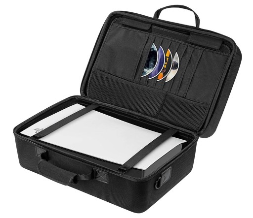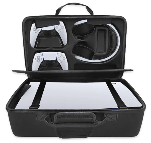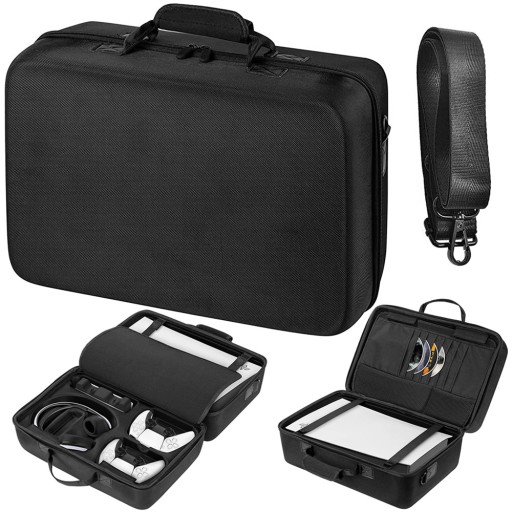 - Pozwala transportować konsolę oraz wszystkie akcesoria (pady Dualsense, headset, stację dokującą, ładowarkę, kable zasilające i sygnałowe, gry, słuchawki i wiele innych