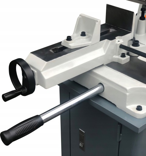 - Możliwość ustawienia ramienia w pionie i używanie maszyny jak pionowej przecinarki taśmowej.