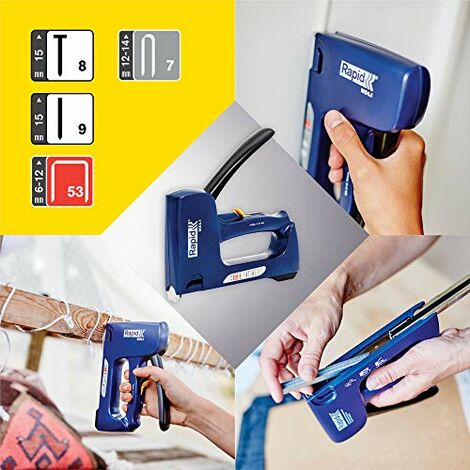 - -: Uniwersalny magazynek na zszywki z cienkiego drutu 53 (6-12mm), zszywki do kabli 7 (12-14mm), sztyfty 8 (15mm) oraz szpilki 9 (15mm)
