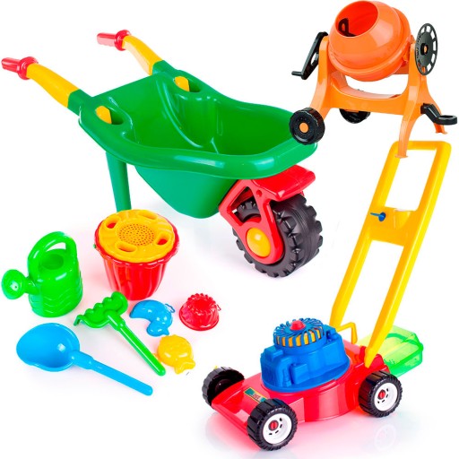 Taczki dla dziecka + zestaw do piasku 8 el. + Kosiarka z koszem + Betoniarka LENA