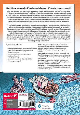 Ta książka jest kolejnym, uzupełnionym i zaktualizowanym wydaniem kultowego podręcznika dla profesjonalnych administratorów zarządzających środowiskami produkcyjnymi w korporacjach czy urzędach. Znajdziesz tu obszerne wyjaśnienie takich zagadnień, jak instalacja systemu, skrypty powłoki, kontrolowanie procesów czy konfiguracja uprawnień. Dowiesz się, jak zarządzać użytkownikami, przestrzenią dyskową, zadaniami okresowymi oraz backupami. Przestudiujesz zagadnienia sieciowe, a zwłaszcza kwestie bezpieczeństwa i reakcji na incydenty. W tym wydaniu znajdziesz m.in. omówienie demonów zarządzania systemem, zasady zarządzania kontem użytkownika root, techniki kontroli wersji za pomocą Git, kwestie związane z zarządzaniem sieciami w chmurze, tworzeniem i utrzymywaniem centrów danych, opis metodologii DevOps i wiele innych!