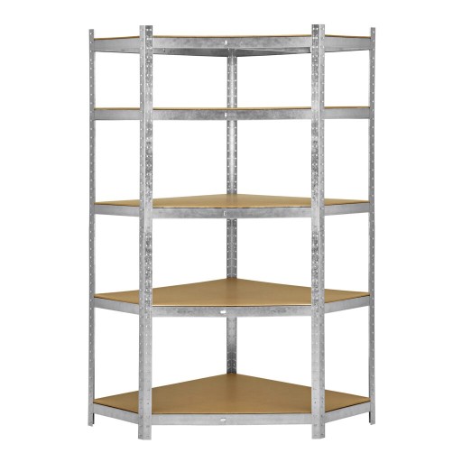 Regał narożny z pięcioma wzmocnionymi półkami.
