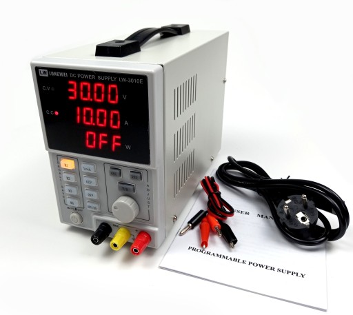 Programowalny cyfrowy precyzyjny zasilacz laboratoryjny renomowanego producenta Long Wei typu LW3010E. Właściwie to już połączenia zasilacza z komputerem/PLC - programowalne urządzenie zasilające z cyfrową syntezą / wprowadzaniem nastaw, z pamięcią nastaw z możliwością szybkiego przełączania między nastawionymi programami (z panela czołowego przyciskami M1 ... M4 lub przez interfejs RS485 z komputera PC). Zakres reguacji napięcia wyjściowego 0...30VDC z rozdzielczością 10mV, zakres regulacji ogranicznika prądu wyjściowego 0,00 ... 10,00ADC z rozdzielczością nastawy 10mA.