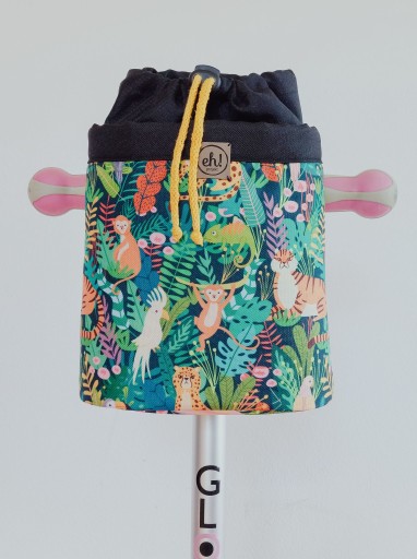 Są zamocowane na rzepy i pasują do większości hulajnóg i rowerków. U nas nawet takich, które posiadają hamulce i dzwoneczki.