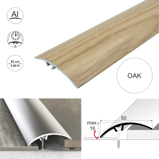 Doskonałej jakości aluminiowa listwa progowa w kolorze dębu. Idealna do łączenia podłóg drewnianych, laminowanych, dywanowych, winylowych lub płytek, które są na tym samym lub różnym poziomie (do max 16 mm). Dwie silikonowe uszczelki tworzą barierę dla wilgoci i zanieczyszczeń wokół listwy. Zakrywa szczeliny miedzy podłogami.
