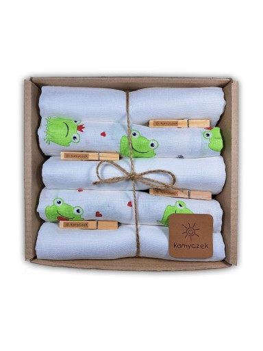 Komplet 5 sztuk najwyższej jakości pieluszek jest efektownie opakowany, gotowy do wręczenia jako prezent. W zestawie znajduje się również gratis w postaci firmowych klamerek.