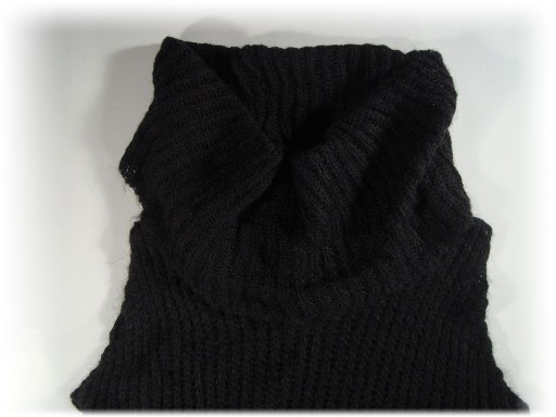 Śliczny, duży, szeroki, zakrywający zalotnie ramiona, prażkowany golf szalowy pod szyją nadaje stylu i ekspresji.