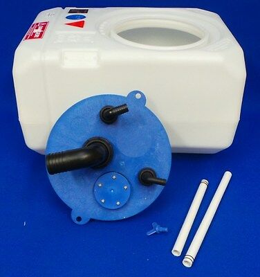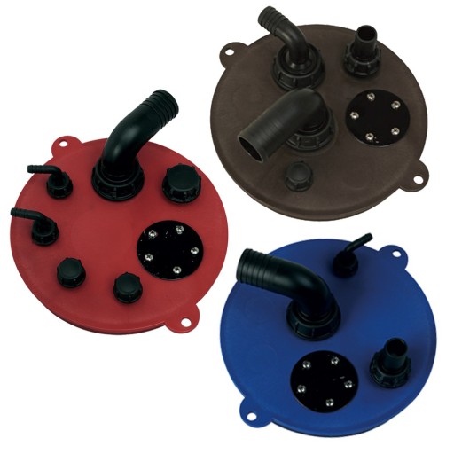 Gwintowana pokrywa zbiornika na wodę z kompletem króćców, wykonana z tworzywa sztucznego.