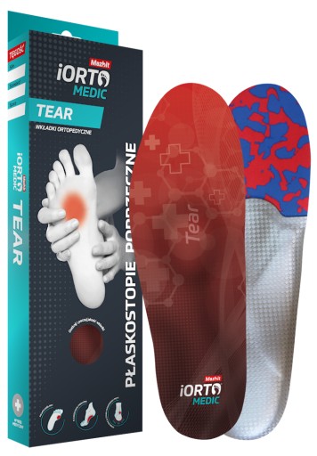 Wkładka iORTO MEDIC Tear stworzone są z myślą o osobach z płaskostopiem poprzecznym. W jej produkcji zastosowano dwie technologie: wsparcie łuku podłużnego stopy o zmiennej dynamice dostosowane do wagi użytkownika oraz wsparcie łuku poprzecznego stopy, które uzyskuje się dzięki wykorzystaniu peloty w kształcie kropli podpierającej II i III głowę kości śródstopia. Taka budowa pozwala na eliminację przyczyny schorzenia i aktywizuje stopę do prawidłowego przetaczania.