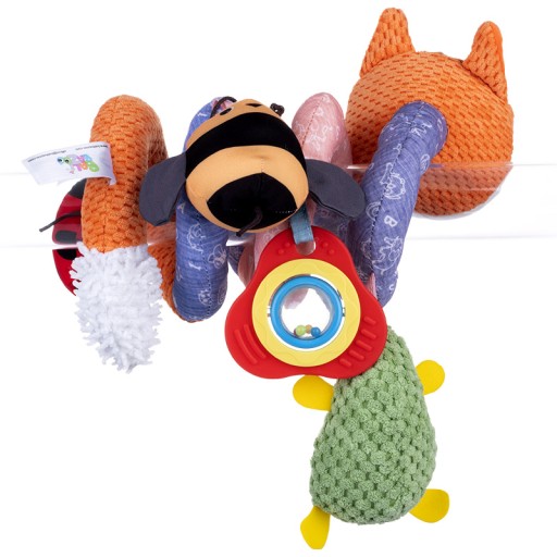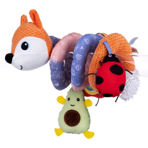 Rudy lisek z wesołą ekipą zapraszają do multifunkcyjnej zabawy! Ta urocza spiralka wykonana została ze zróżnicowanych materiałów, które stymulują zmysł dotyku dziecka. Dodatkowo, każda z zawieszek wyposażona została w inną funkcję, aby zapewnić najmłodszym inspirującą rozrywkę. Milusie awokado zabawnie grzechocze, zawieszka z koralikami sprawdzi się wspaniale w roli gryzaka, biedronka z bezpiecznym lusterkiem zapozna dziecko z samym sobą, a pszczoła rozweseli uroczym popiskiwaniem.
