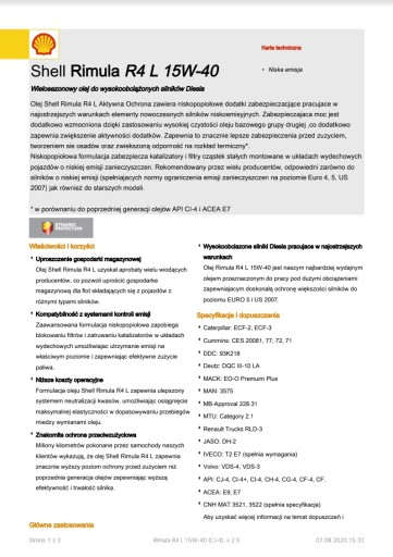 Olej Shell Rimula R4 L zawiera niskopopiołowe dodatki zabezpieczacjące pracujace w najcięższych warunkach elementy silników niskoemisyjnych. Zabezpieczajaca moc jest dodatkowo wzmocniona dzięki zastosowaniu wysokiej czystości oleju bazowego grupy drugiej ,co dodatkowo zapewnia zwiększenie aktywności dodatków. Zapewnia to znacznie lepsze zabezpieczenia przed zuzyciem, tworzeniem sie osadów oraz zwiekszoną odporność na rozkład termiczny.