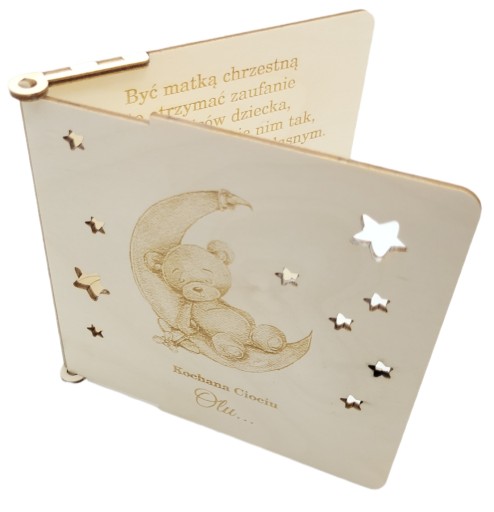 Drewniana prośba, aby ciocia została chrzestną, to piękny i wyjątkowy sposób na wyrażenie szacunku i wdzięczności wobec osoby, która zgodziła się objąć tak ważną rolę w życiu dziecka. Grawerowany tekst na drewnie dodaje jeszcze bardziej osobistego i wyjątkowego charakteru temu podarunkowi.
