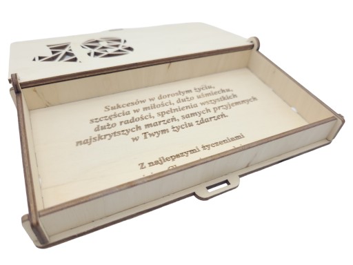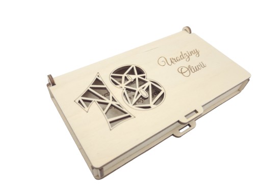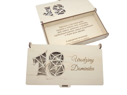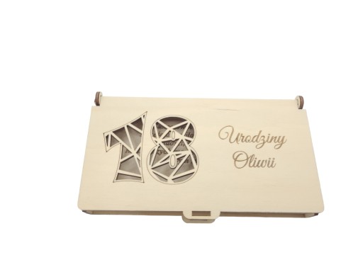 Drewniane pudełko na pieniądze z ażurową cyfrą 18 i indywidualnym grawerem to świetny sposób na przekazanie życzeń z okazji 18 urodzin, który zapewni pamiątkę na długie lata.