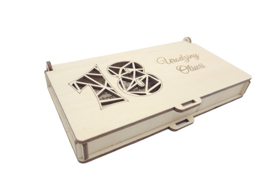 Ażurowa cyfra 18 wycięta jest w drewnie aby nadać pudełku wyjątkowego charakteru.