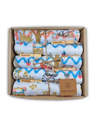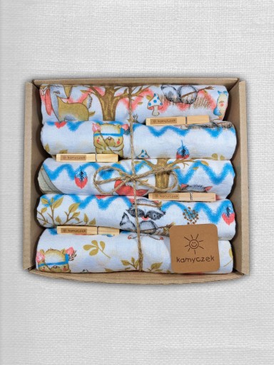 Komplet 5 sztuk najwyższej jakości pieluszek jest efektownie opakowany, gotowy do wręczenia jako prezent. W zestawie znajduje się również gratis w postaci firmowych klamerek.