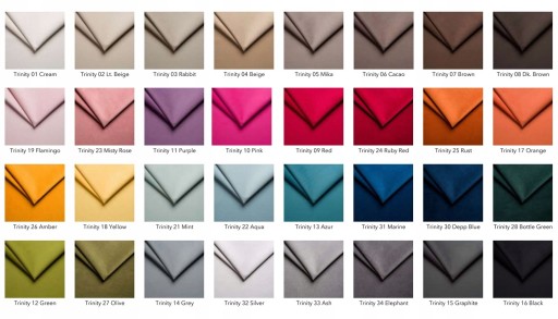 ➡️ Trinity to popularna welurowa tkanina obiciowa. Jej cechą charakterystyczną jest delikatna struktura i powierzchnia pokryta drobnym meszkiem - w dotyku miękka i przyjemna. Cieszy się popularnością ze względu na subtelne, cieniowanie materiału oraz matowe kolory. Odporna na ścieranie oraz działanie światła. Dzięki zastosowanej technologii Cleanaboo jest odporna na wchłanianie rozlanych płynów. niezwykle przytulna, miękka w dotyku tkanina o gładkiej strukturze.