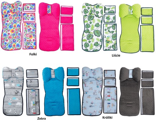 Wkładka posiada 6 otworów na pasy bezpieczeństwa, otwory na zamocowanie poduszki motylka oraz dwa otwory na 5-punktowe pasy bezpieczeństwa. Wkładki są uniwersalne testowane na wielu wózkach dziecięcych dostępnych na rynku.