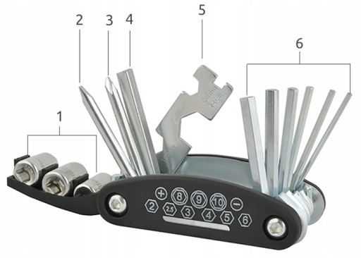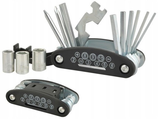 Komplet zawiera 16 najważniejszych narzędzi służących do regulacji roweru. Całość została zamknięta w kompaktowej formie scyzoryka. Po złożeniu mieści się w dłoni, jest łatwy do przechowywania, np. kieszeni lub w sakwie rowerowej. W zestawie znajdują się klucze imbusowe, wkrętaki, nasadki wraz z adapterem, a także klucze płaskie oraz specjalny klucz do szprych.