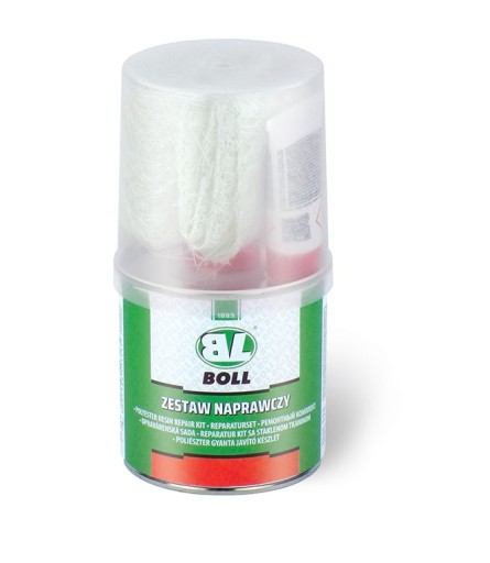 BOLL zestaw naprawczy składa się z żywicy poliestrowej (242 g), utwardzacza (8 g) oraz maty szklanej (0,25 m 2). Służy zarówno do wypełniania znacznych ubytków materiału w karoseriach samochodowych, łodziach, przyczepach itp. jak i do wzmacniania i usztywniania konstrukcji naprawianych elementów. Żywica posiada bardzo dobrą przyczepność do metalu, powierzchni plastikowych, stali, szkła, drewna i betonu. Jest odporna na temperaturę do 80°C, wpływ czynników atmosferycznych, benzyny, smarów, olejów, rozcieńczonych kwasów i zasad. Cechuje się dużą sprężystością i krótkim czasem utwardzenia. Po utwardzeniu posiada bardzo dużą wytrzymałość mechaniczną, może być szlifowana i pokrywana dowolnymi szpachlami poliestrowymi.