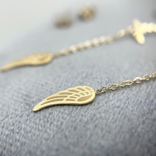 ⭐ Złote wiszące na kulecznce kolczyki sztyfty z zawieszkami w kształcie linii życia i skrzydełka, ze stali chirurgicznej ⭐