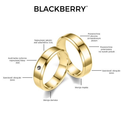 Luksusowe obrączki ślubne wykonane z najwyższej jakości stali szlachetnej, chirurgicznej 316L. Te obrączki to wyjątkowo szlachetne połączenie stali i złota oraz błyszczących znanych na całym świecie Austriackich szlifowanych cyrkonii, które zdobią obrączkę damską. Perfekcyjne wykonanie z wysoką dbałością o wszelkie detale oraz połysk gwarantują produkt najwyższej jakości. Doskonała kompozycja stworzona, by cieszyć, zachwycać i podkreślać miłość, jaką darzą się osoby decydujące się na wspólne życie. Idealne obrączki, które chciałoby się nosić na palcu przez cały czas i nie zdejmować ich nawet na chwilę.