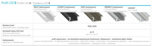 Profil aluminiowy B do wpuszczania w wyfrezowane na powierzchni otwory. Jeden z najbardziej minimalistycznych i nowoczesnych projektów. Idealny do montażu wewnątrz wyfrezowanego otworu. Minimalna wymagana głębokość otworu to zaledwie 9 mm.