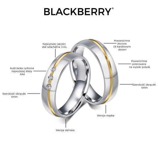 Luksusowe obrączki ślubne wykonane z najwyższej jakości stali szlachetnej, chirurgicznej 316L. Te obrączki to wyjątkowo szlachetne połączenie stali i złota oraz błyszczących znanych na całym świecie Austriackich szlifowanych cyrkonii, które zdobią obrączkę damską. Perfekcyjne wykonanie z wysoką dbałością o wszelkie detale oraz połysk gwarantują produkt najwyższej jakości. Doskonała kompozycja stworzona, by cieszyć, zachwycać i podkreślać miłość, jaką darzą się osoby decydujące się na wspólne życie. Idealne obrączki, które chciałoby się nosić na palcu przez cały czas i nie zdejmować ich nawet na chwilę.